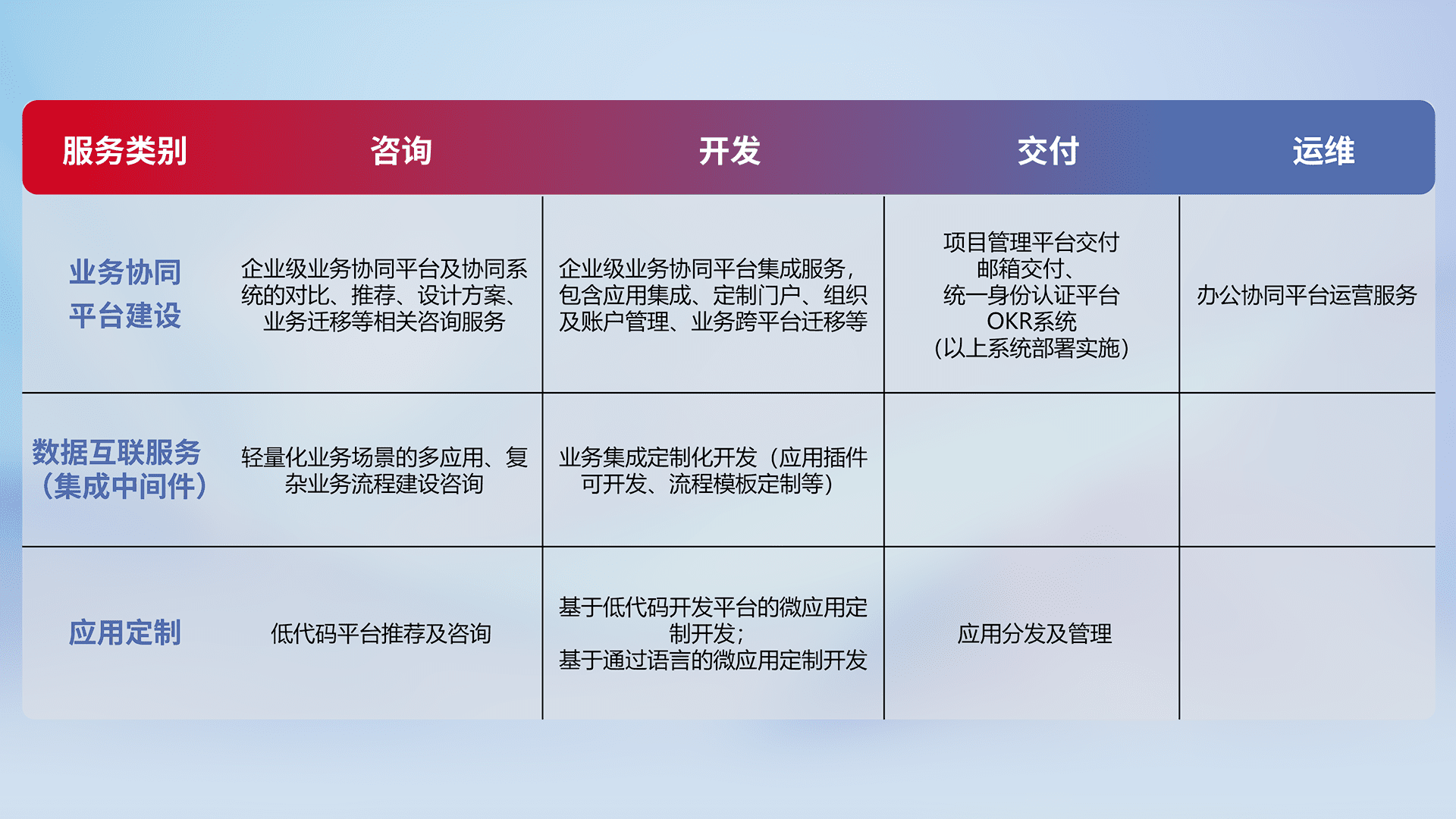 针对钉钉、、、企微、、IDaas等平台级产品提供产品的规划、、、方案、、、、交付、、、、定制化开发等服务,,,,实现如统一协同办公、、、、智能客户服务、、混合会议管理、、智能数据查询、、、等业务场景,,,,实现数字化转型。。。。