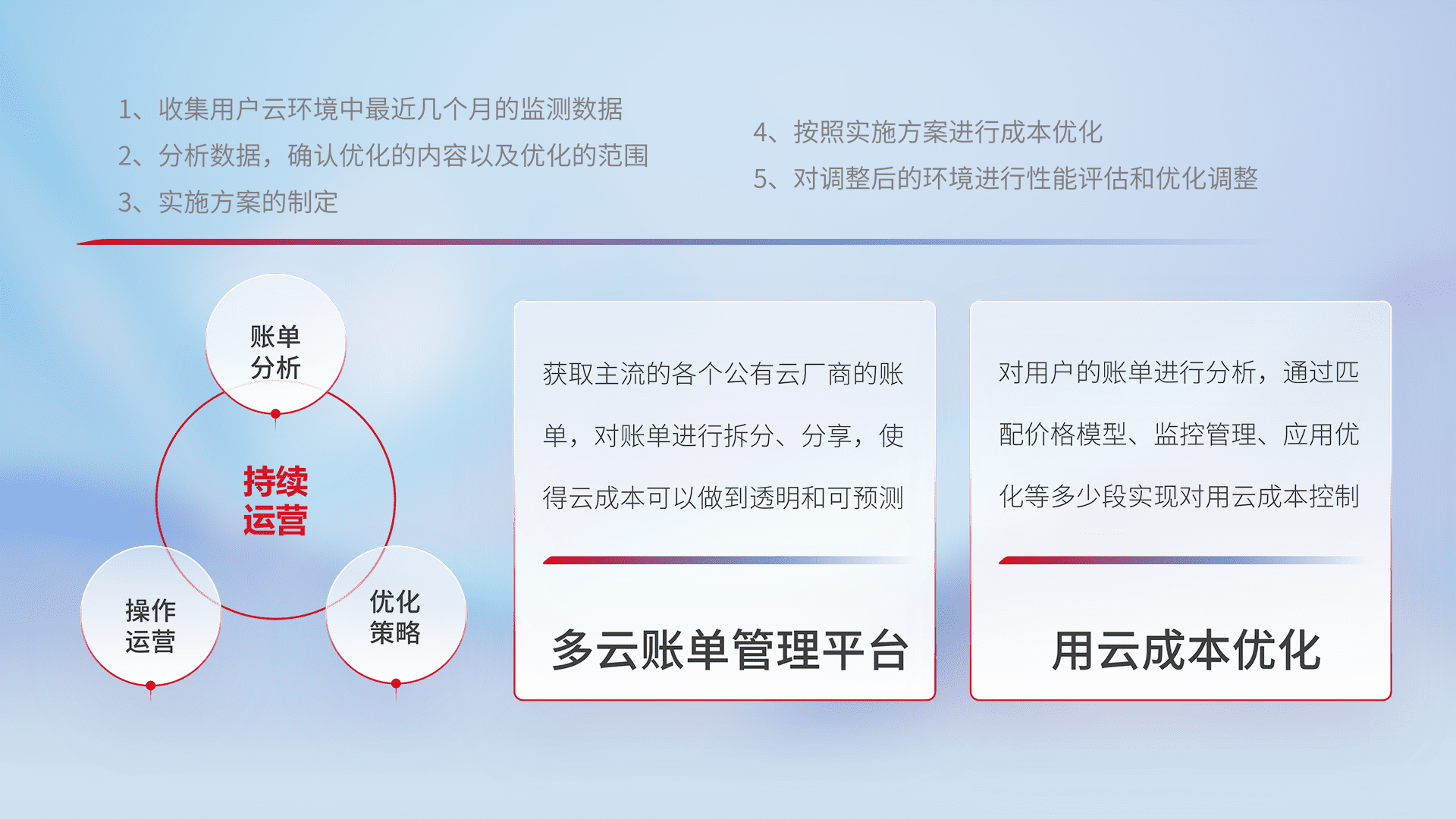 通过多云纳管,,以统一的资源数据模型把客户的云资源进行抽象和封装,,,,进而实现对多云资源的统一操作,,,保障云资源管理的可靠性、、、、稳定性与可用性。。量身定制化运维内容,,配置、、、、开发运维、、补丁管理、、、备份、、、、监控、、、认证和访问管理、、、审计和日常巡检等,,,保障在用云过程中的可靠度,,,稳定度以及高可用率。。。。